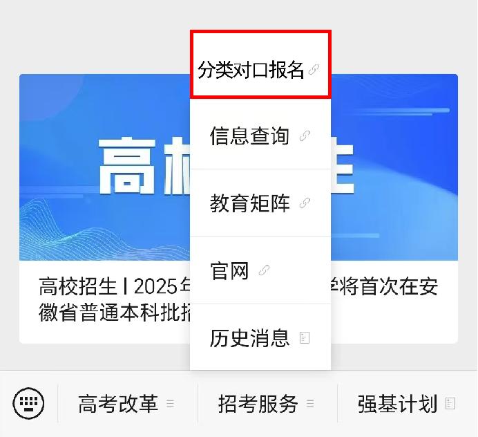 1.用浏览器访问gkbm.ahzsks.cn或通过安徽省教育招生考试院微信公众号访问(进入微信公众号,选择“招考服务”-“分类对口报名”)。
