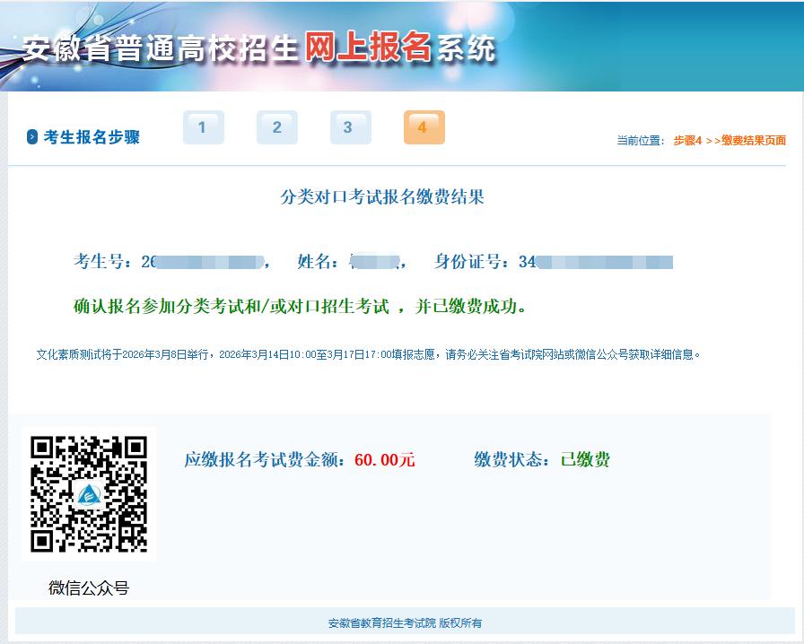 3.符合文化素质测试免试条件的考生也要完成报名、缴费和后期的填报志愿。(信息来源:安徽省教育招生考试院网站)