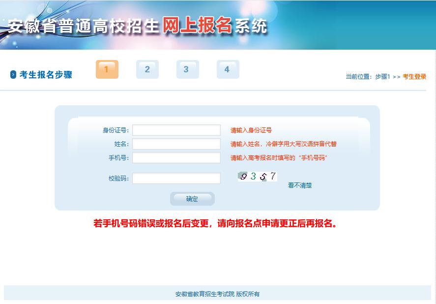 4.登录系统报名需要填写高考报名时填报的“手机号码”,若遗忘,可以到报名点、当地招生考试机构查询。如手机号码错误或报名后变更,请向报名点申请更正后再报名。