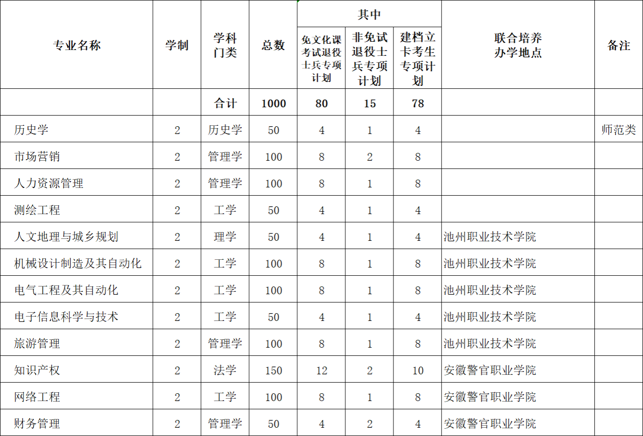 池州学院2025年普通招生分省分专业计划表